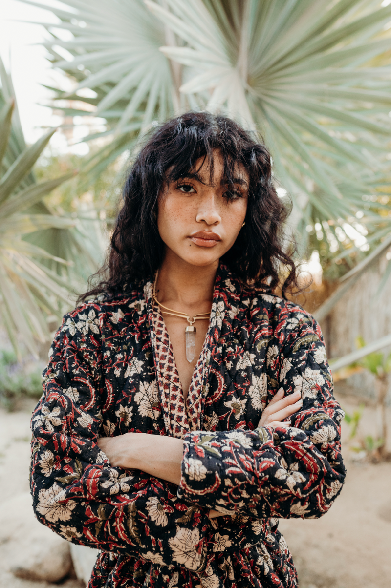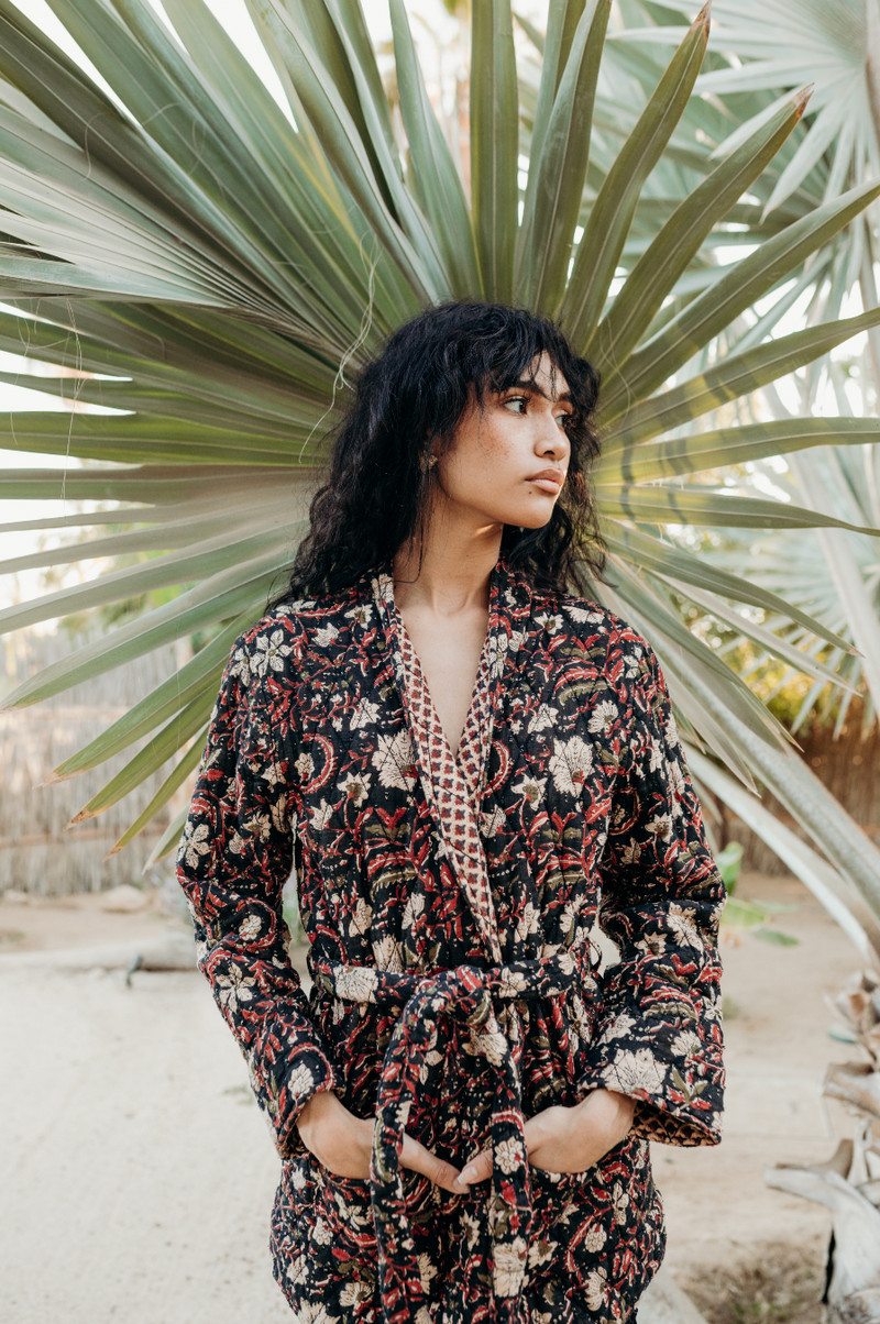 Step into the winter wrapped in the unapologetically bold Theodora quilted Jacket. This piece marries vintage-inspired floral patterns with a rugged, bohemian edge. The rich tapestry of colours - deep burgundy, olive, and ivory set against a black background.