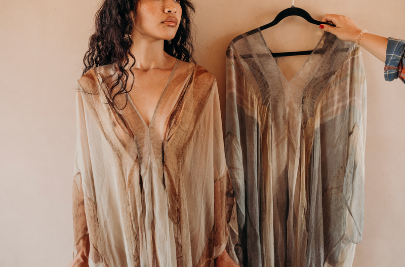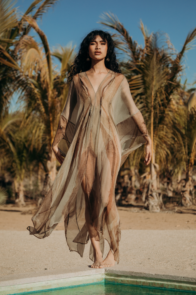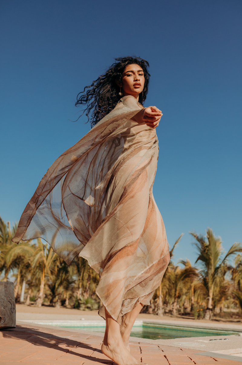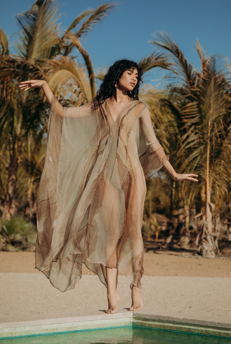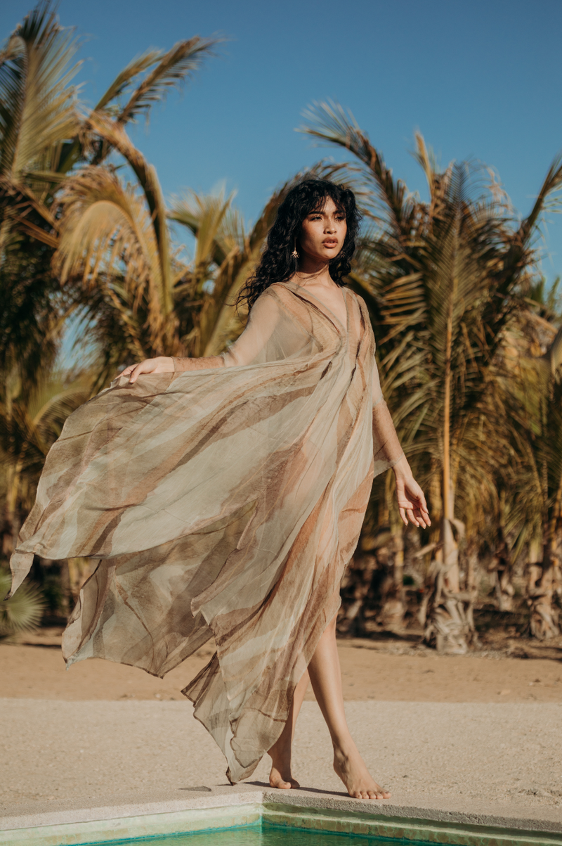 Crafted from a soft and flowy chiffon fabric, this relaxed kaftan boasts a captivating abstract print designed by The White Raven, inspired by the natural texture of the stones, giving it a unique and artistic flair. The relaxed fit allows for effortless movement and comfort.