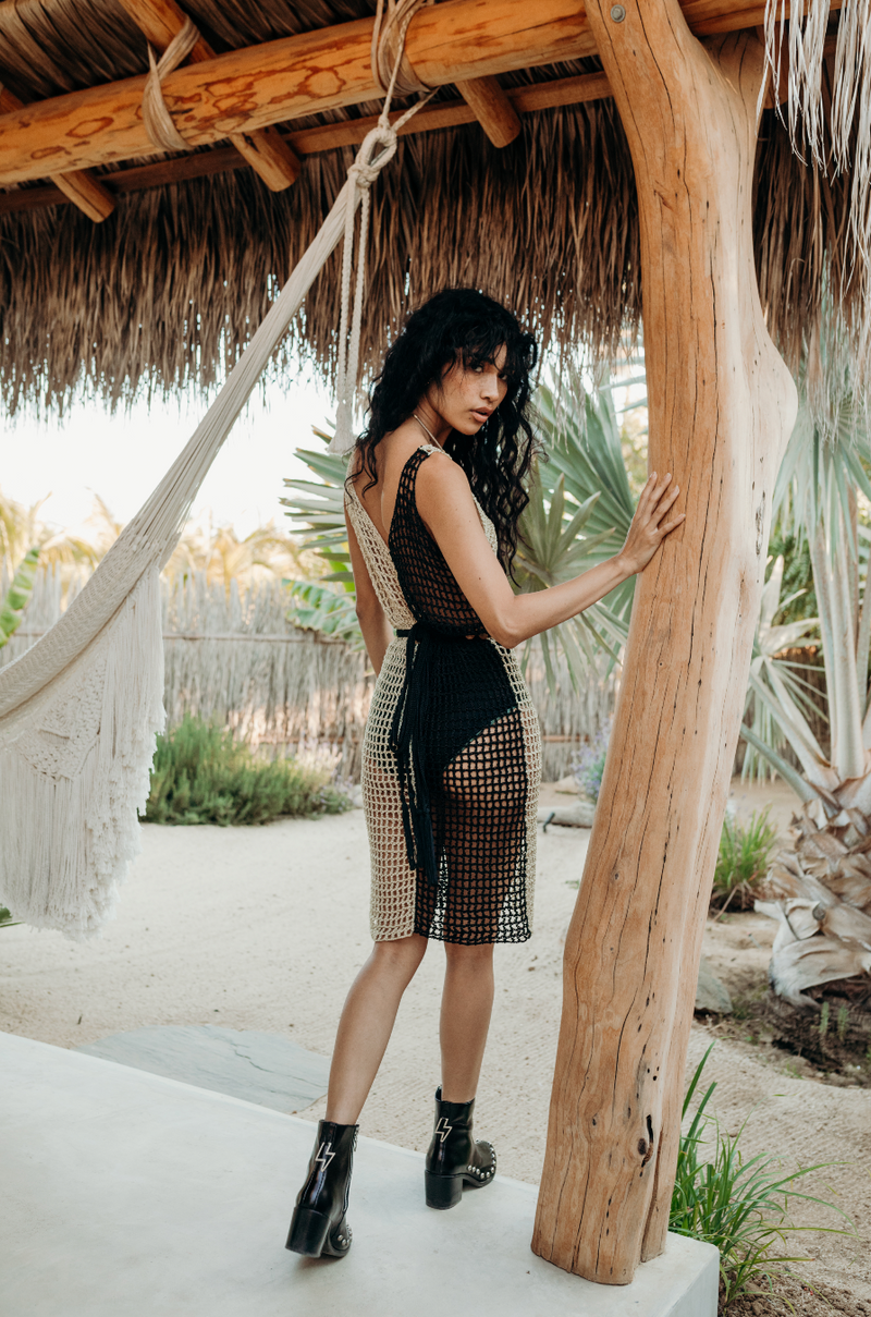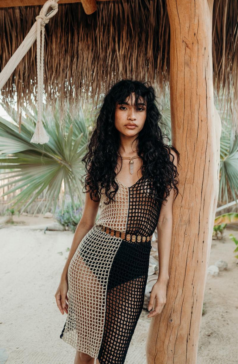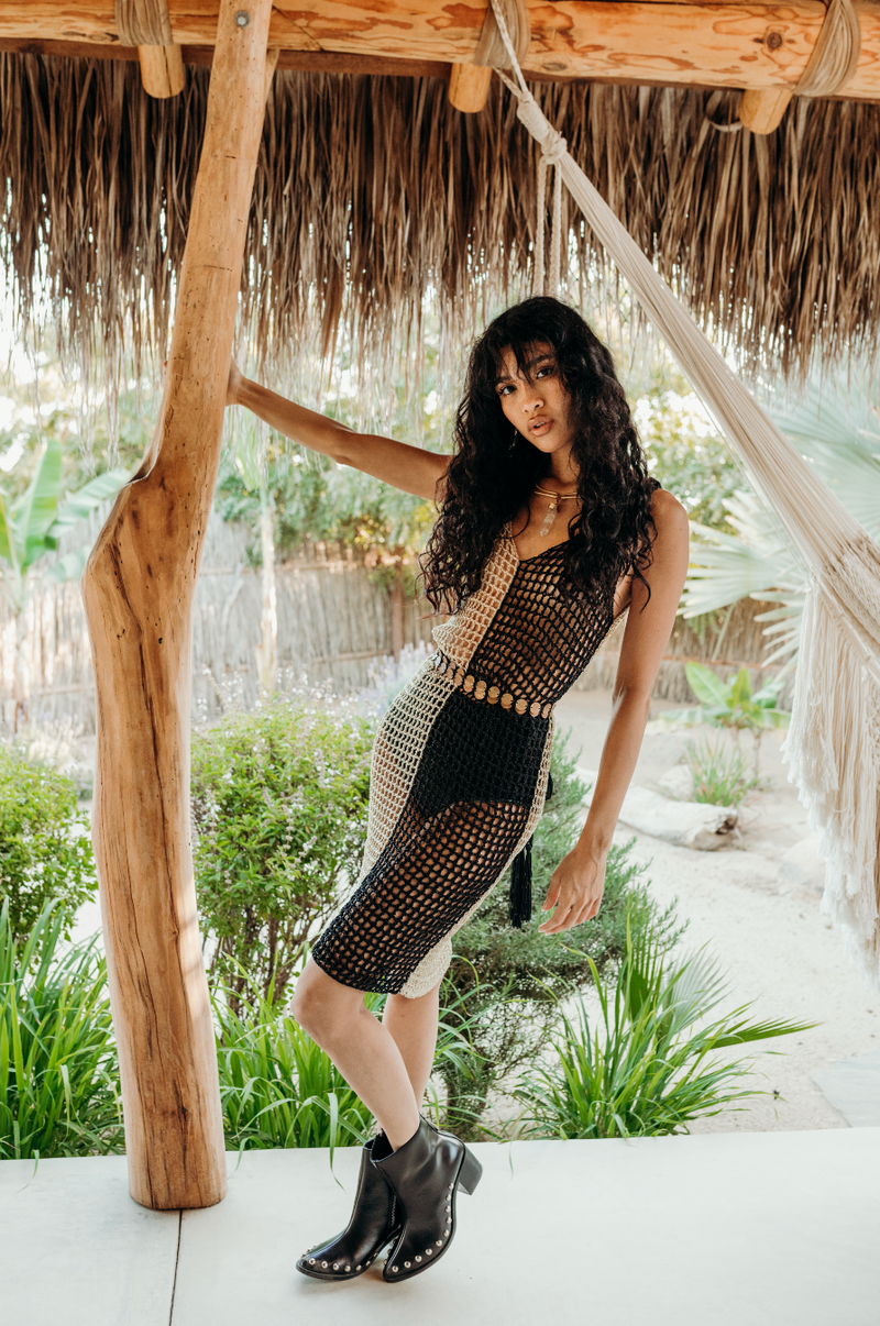 Hand woven in south east mexico. This particular dress comes in one color way: black/cream. One size, fits XS-L.