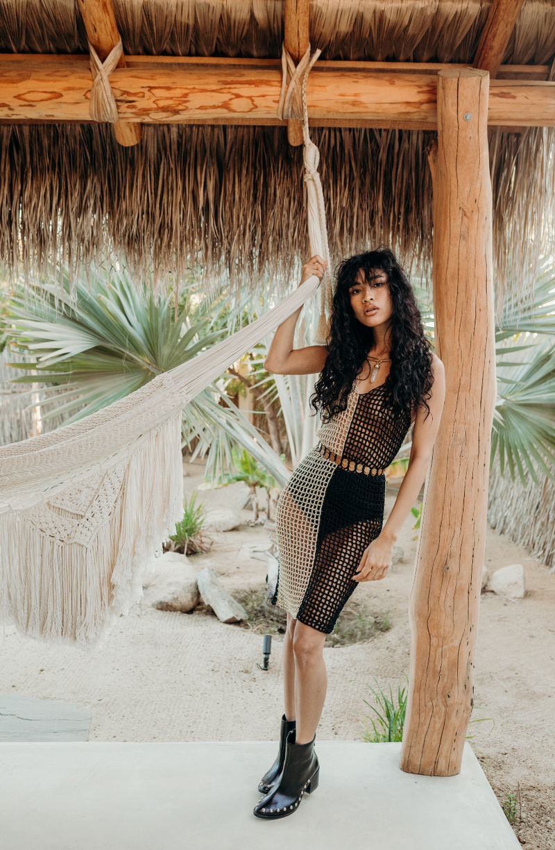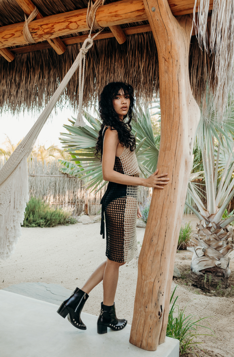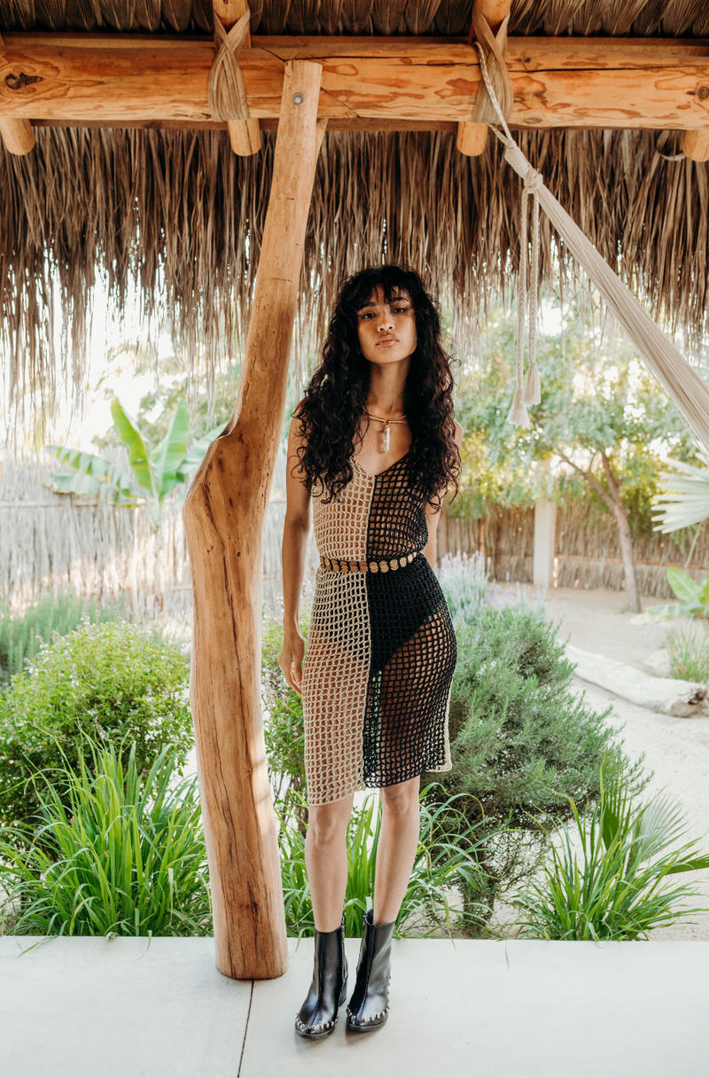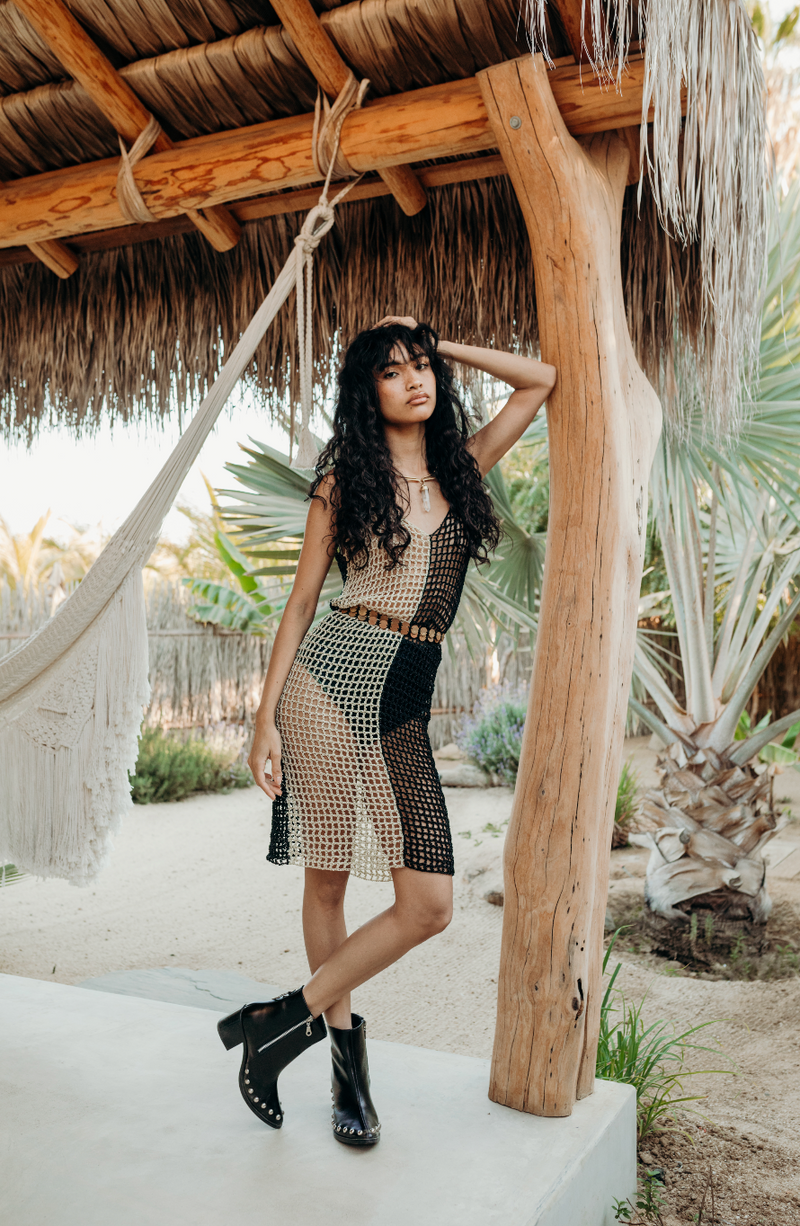 Hand woven in south east mexico. This particular dress comes in one color way: black/cream. One size, fits XS-L.