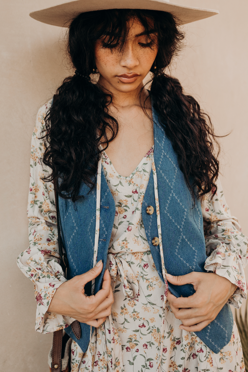 Introducing our Indigo Denim Vest – a versatile layering piece. Crafted from soft cotton fabric, it strikes the perfect balance with a thickness that adds structure without compromising comfort. The four brown buttons and thin white laced detailing offer a unique look. Embrace the versatility of this vest by wearing it open or done up, or layer it over a shirt/dress showcasing your personal style. The angular hemline adds a modern edge to the classic vest look.