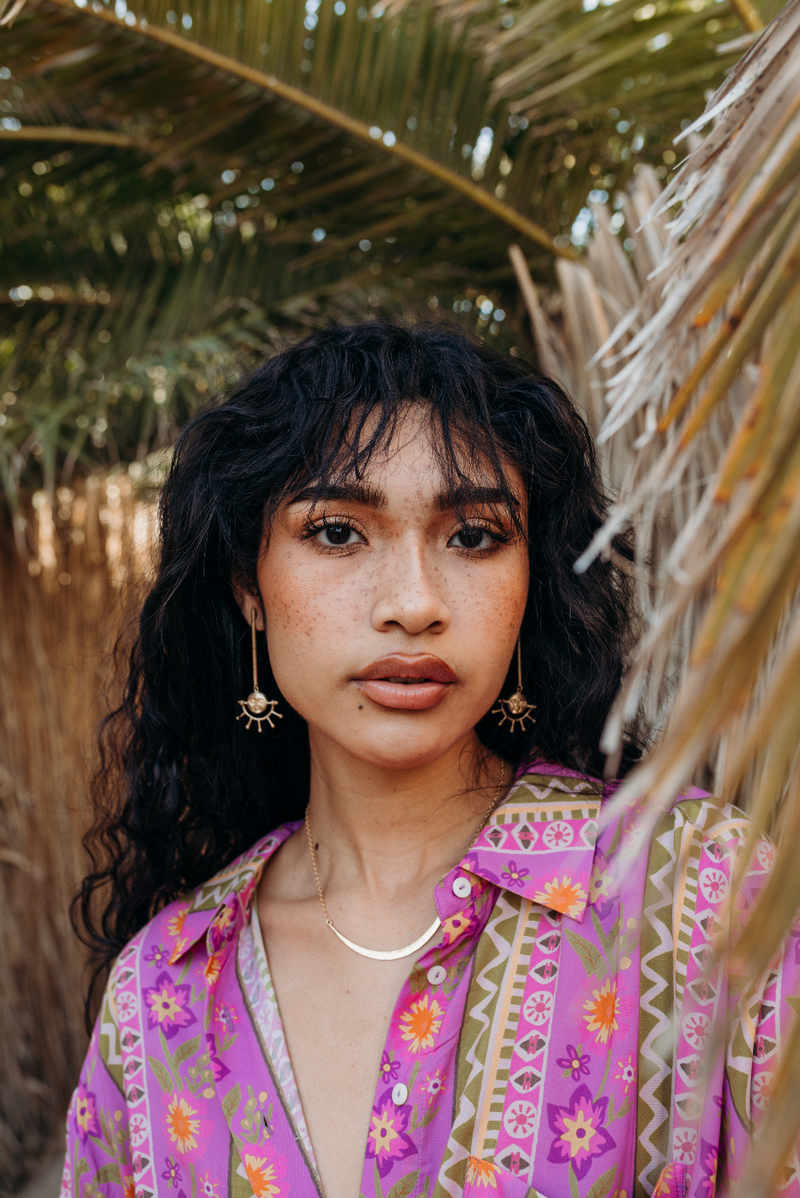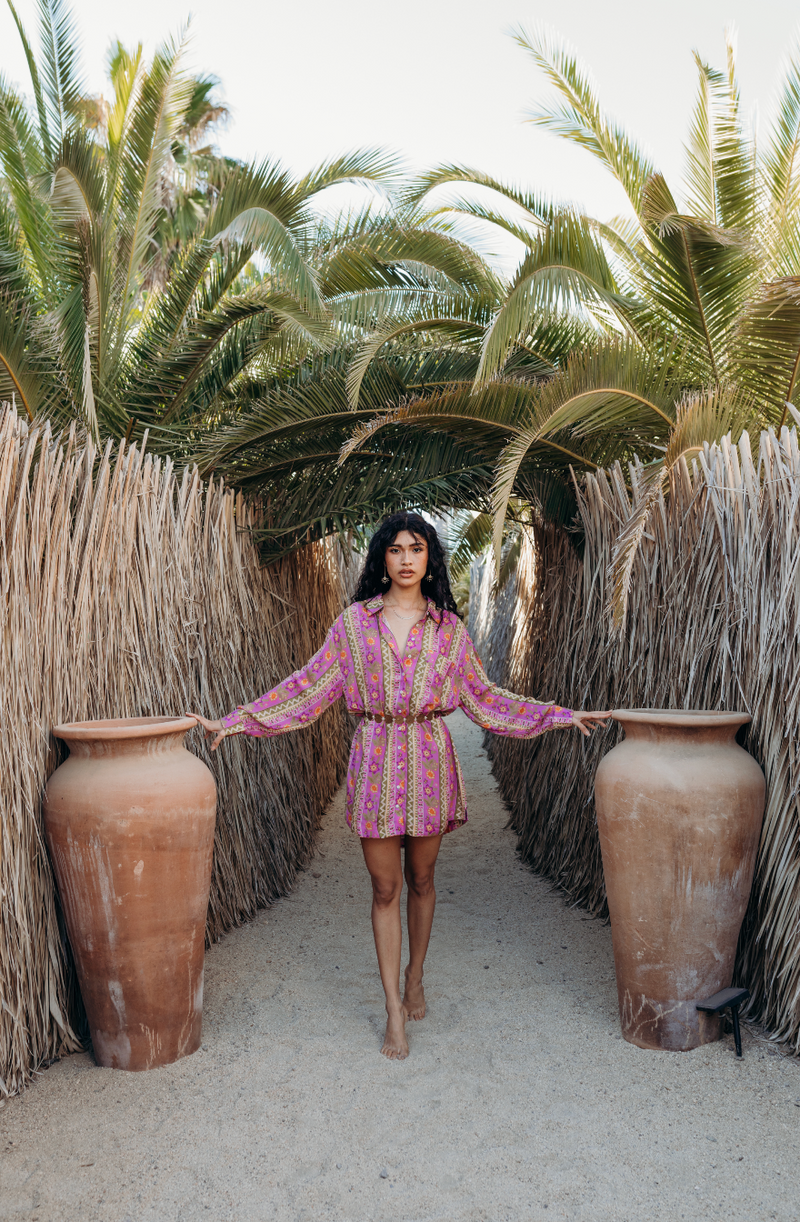 The Goldie Shirt in Desert Rose is an effortless blend of vintage charm and modern ease. Crafted from soft LENZING™ ECOVERO™ Viscose, this relaxed silhouette features an allover print, a classic shirt collar, and a functional button placket with contrast buttons for a hint of intrigue. A chest pocket and buttoned cuffs add timeless details, while subtle hem splits create a flattering drape. Style it open over swim, tucked into denim, or paired with the Goldie Strappy Maxi Dress for a bold print-on-print moment. We can’t wait to see how you wear this beauty!